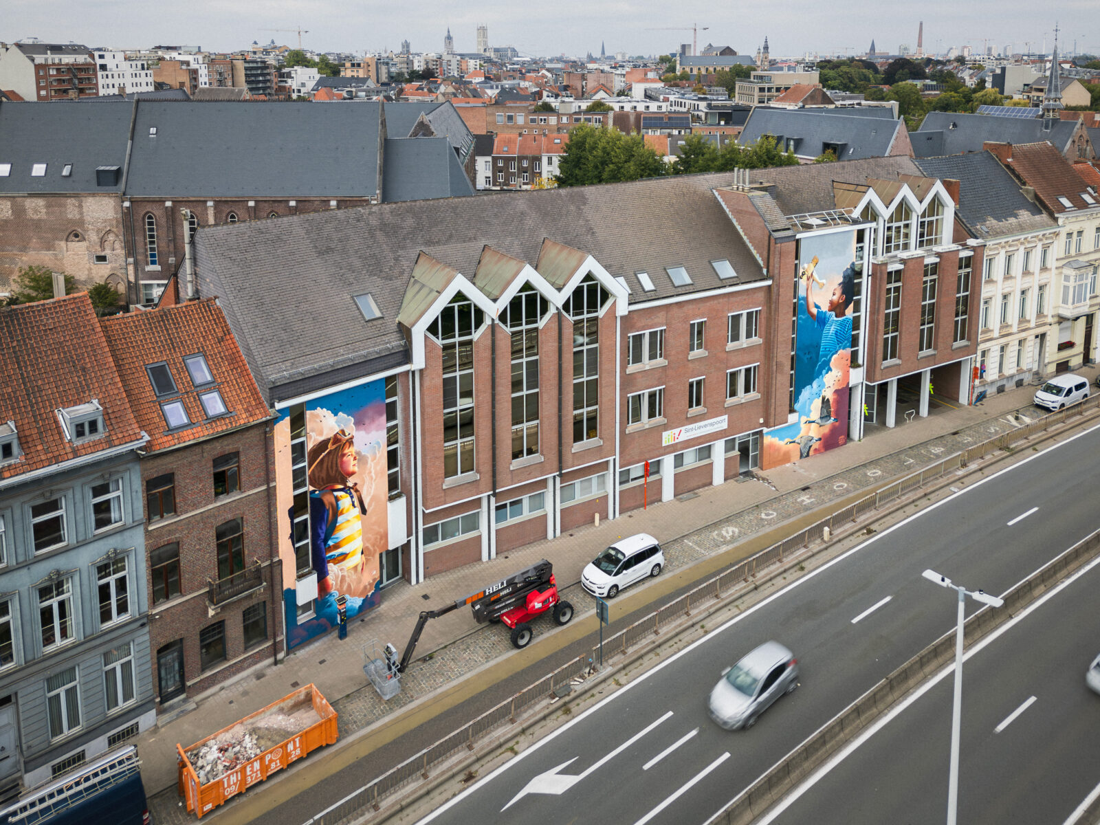 The two monumental works adorn the façades of VZW Sint-Lievenspoort in Ghent, a place that has been supporting children and young people with hearing, speech, and communication challenges for many years.